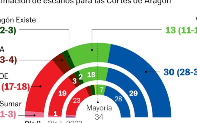 Por bloques, la derecha y la extrema derecha reunirían 43 escaños y el PSOE, IU-Sumar, Aragón Existe y la Chunta, 24. Según la estimación de 40dB., el PP en solitario obtiene seis diputados más en las Cortes regionales que la suma de todas las formaciones de izquierda. Puede consultar todos los datos de la encuesta aquí.