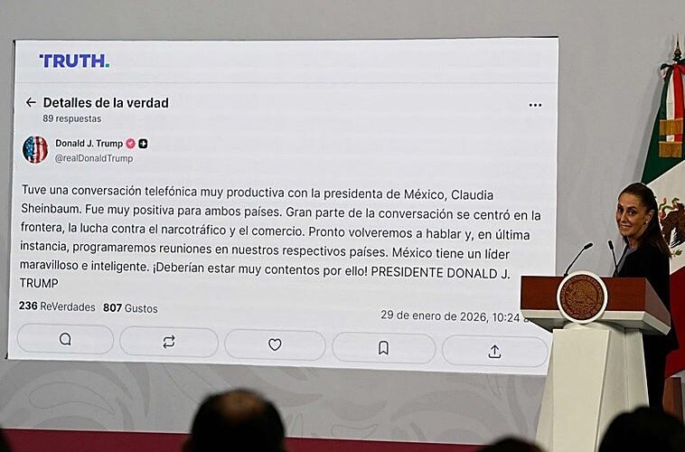 «Tuve una conversación telefónica muy productiva con la presidenta de México, Claudia Sheinbaum. Fue extremadamente buena para ambos países. Gran parte de la conversación se centró en la frontera, la lucha contra el narcotráfico y el comercio«, compartió Trump en su red social Truth.
